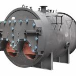 These may be divided into two classes, high or ‘return- tube’ boilers, and low or ‘through-tube’ boilers. High boilers are generally used where they can be conveniently arranged for, but the low boilers are fitted in war vessels of small depth of hold to keep them below the steel deck or water line for protection from shot, &c. These boilers are rather inferior to the low-pressure boiler in economy of generation of steam and in the amount of coal capable of being burnt per square foot of grate with the same draught. Figs. 29 and 30 show the general arrangement of a large example of the high type of cylindrical marine boiler used for pressures of 150 lbs. to 180 lbs. per square inch. In the diagram, which represents a four-furnace boiler of about sixteen feet diameter, each pair of furnaces has a separate combustion chamber, which is the most general arrangement in these boilers.
